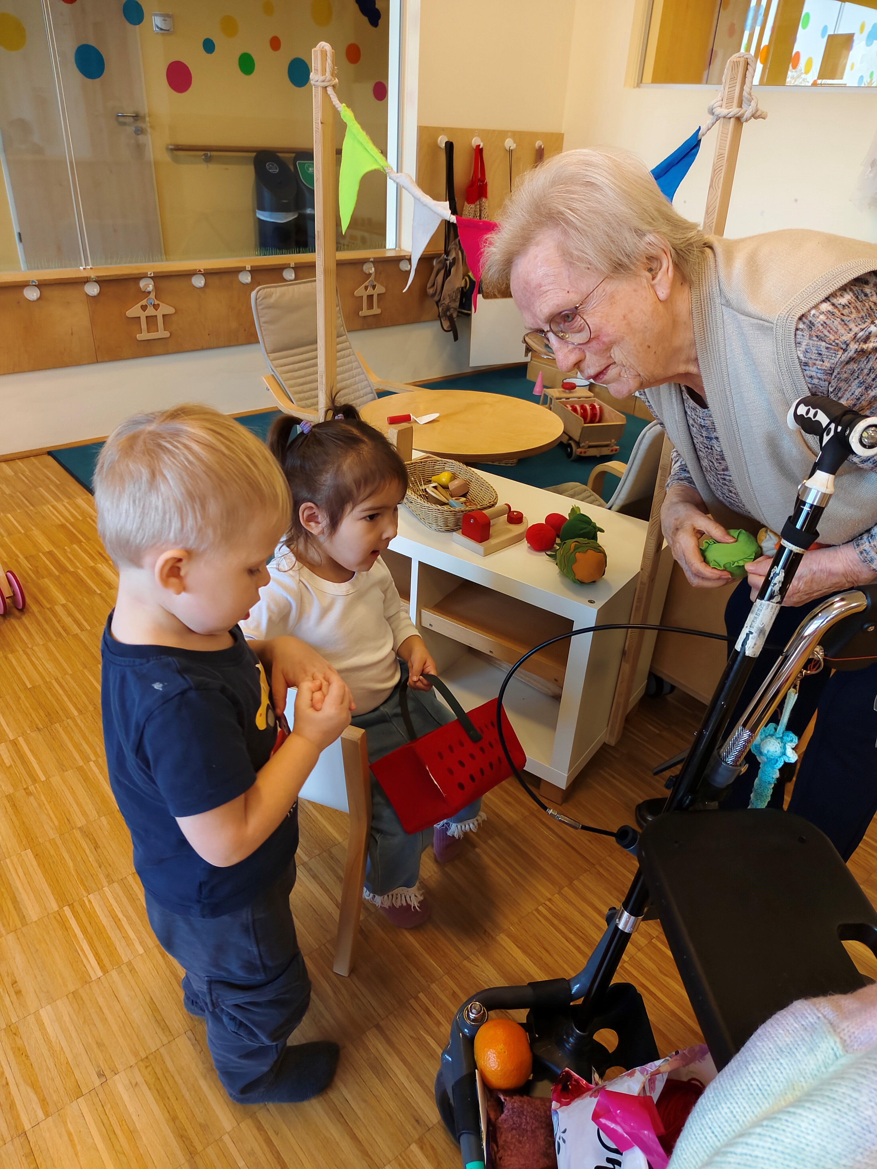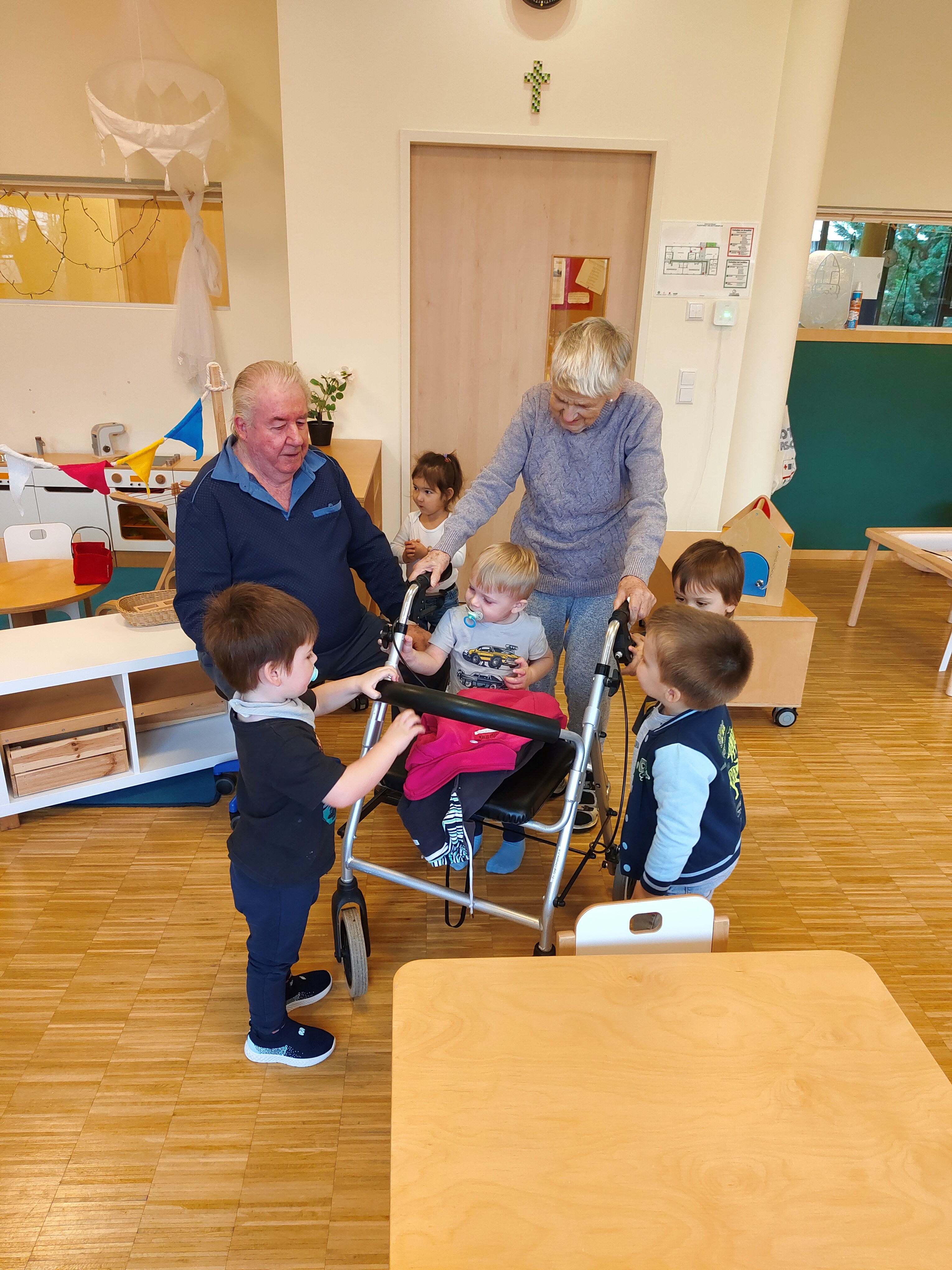 Die Kinder bestaunen neugierig die Gehhilfen und Rollatoren unserer Bewohner:innen – und diese freuen sich sichtlich über das liebevolle Interesse der Kleinsten.